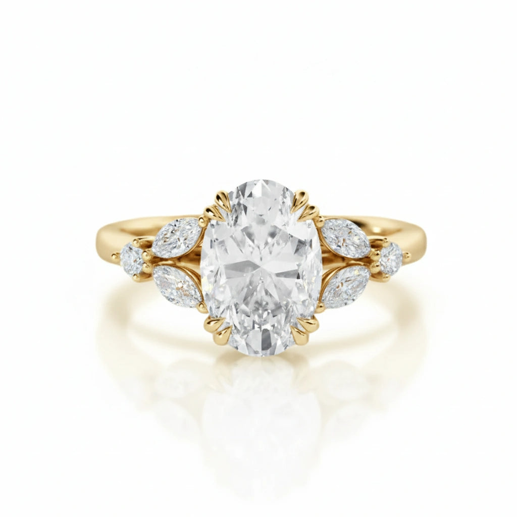 Our Oval Diamond Engagement Ring with Marquise Shape and Round Side Diamonds now available with our Lab Grown Diamonds which are tested to ensure perfect clarity with an optimal price.